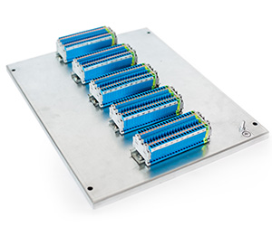 - В исполнениях «КТС-*А» установлены клеммы сечением 2,5 мм2 с безвинтовыми пружинными зажимами и нажимными кнопками открытия этих зажимов с обеих сторон, предусматривающие верхний монтаж проводников. Клеммные сборки установлены на стальной перфорированной несущей DIN-рейке, закрепленной вместе с модулями на монтажной пластине корпуса.
